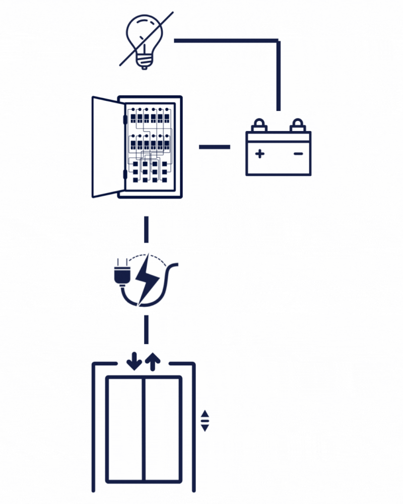 Este sistema atua de forma independente quando ocorre uma interrupção no fornecimento de energia elétrica, conduzindo a cabina de forma controlada até o pavimento mais próximo e liberando os passageiros com segurança. A operação é assegurada por baterias ou fontes auxiliares de energia, integradas ao sistema do elevador.